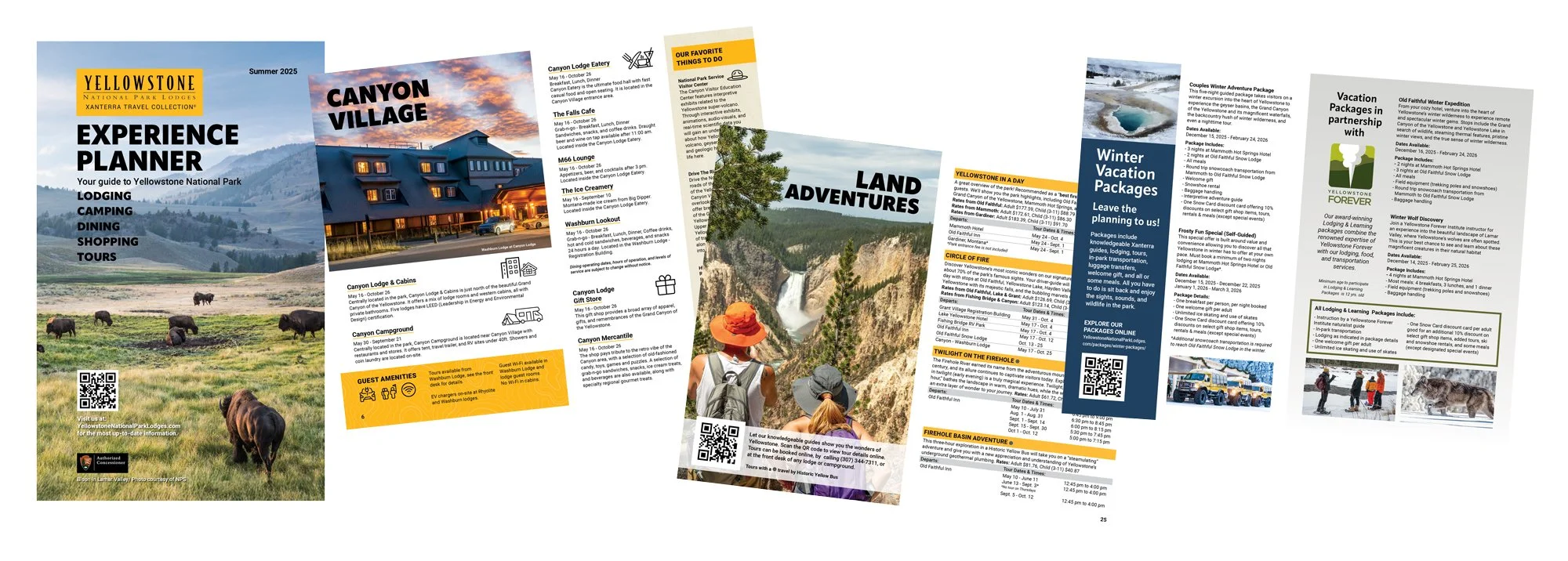The Experience Planner is placed in every hotel room and cabin inside the park. It guides guests to lodging, dining, shopping, and tours run by Yellowstone National Park Lodges. Because cell service and Wi‑Fi are limited in the park, this printed guide is essential for directing guests to dining, shopping, and tour options and capturing additional revenue. Copies are also distributed to visitor centers across Montana and Wyoming to serve as a travel planner. Download Guide