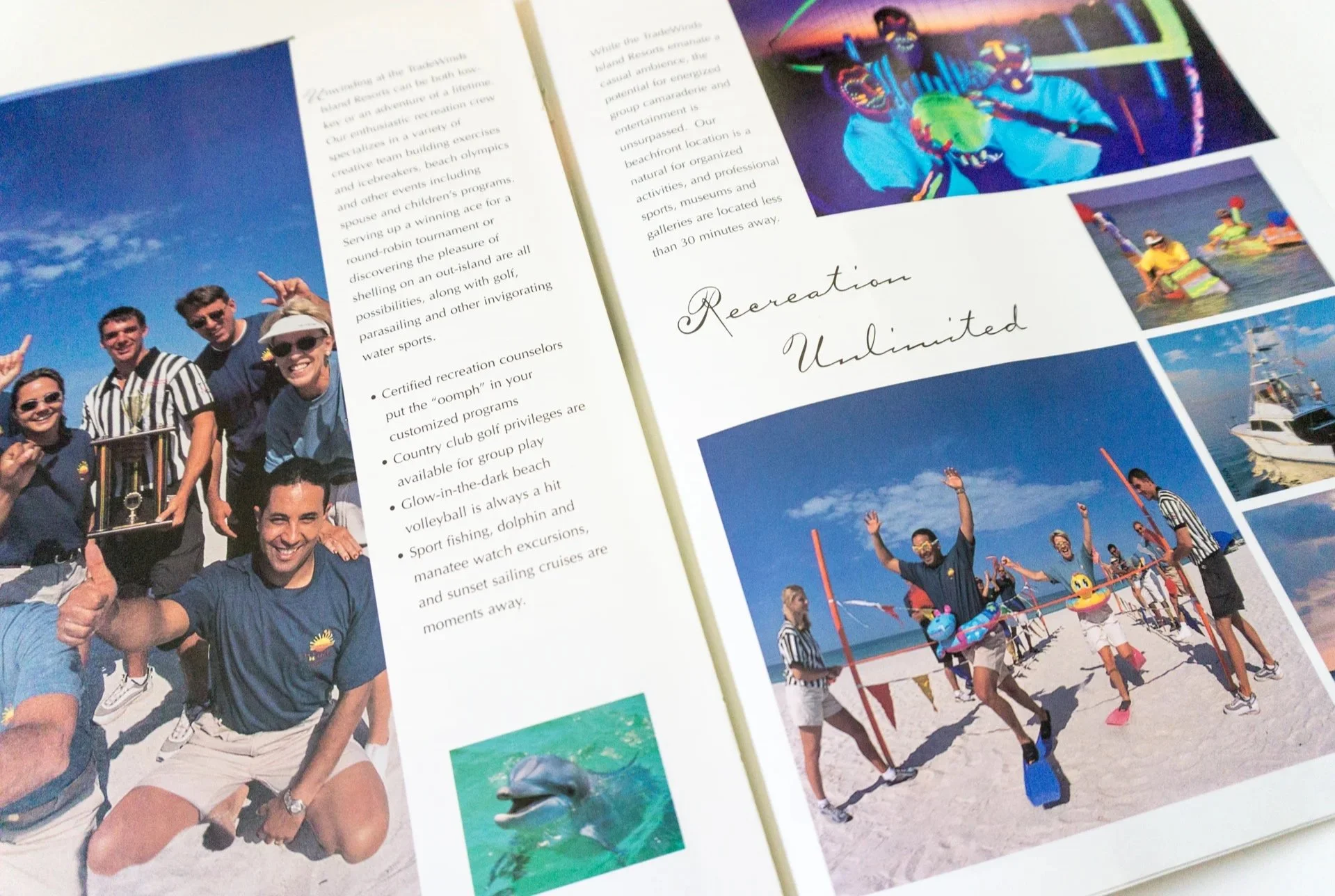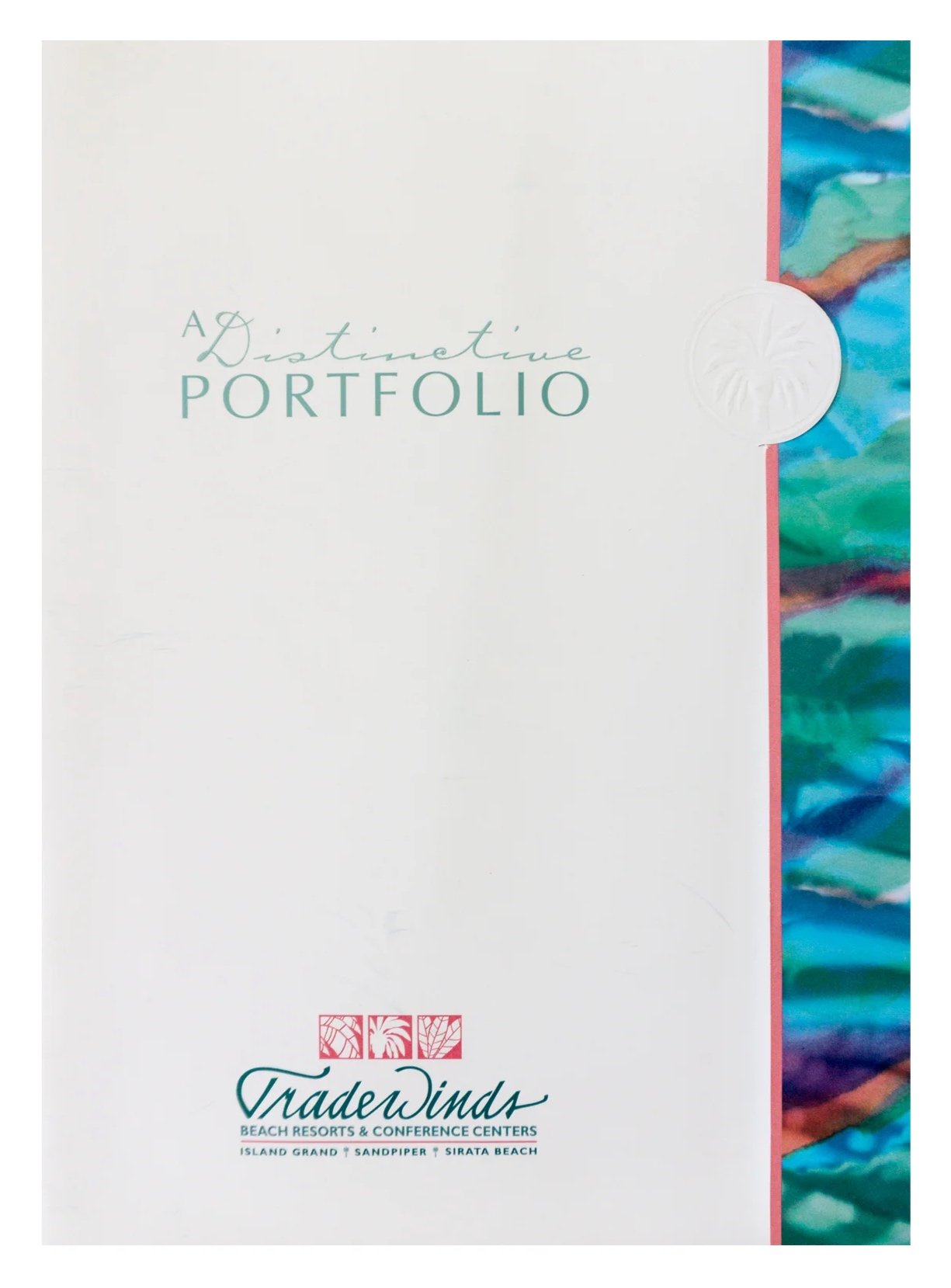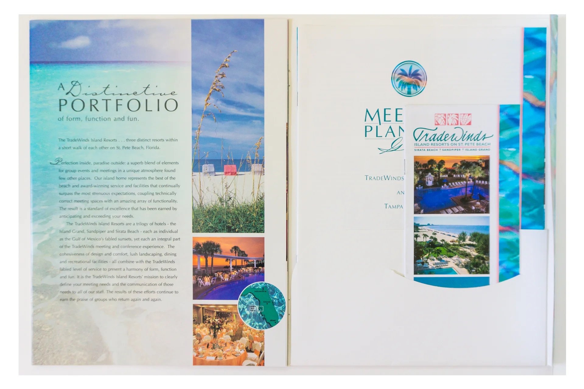 Meeting Planner pocket folder containing stapled pages showcasing the meeting opportunities at the resort. The folder was custom with shaped pockets symbolizing waves. The pockets held brochures and guides for meeting planners.