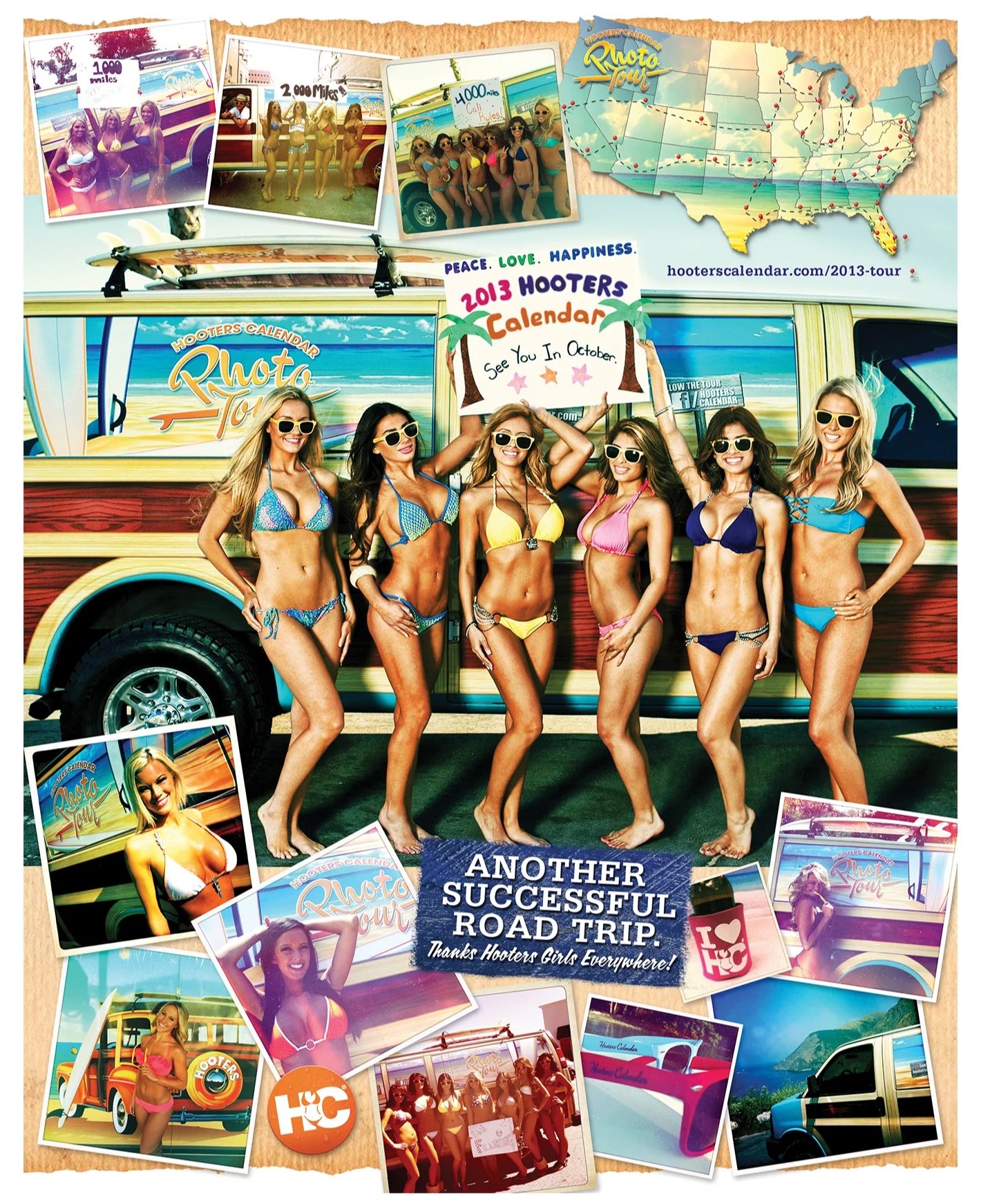 Yearly swimsuit calendar featuring over 200 Hooters Girls. Distributed across the U.S. and sent to troops overseas as part of Operation Calendar Drop.